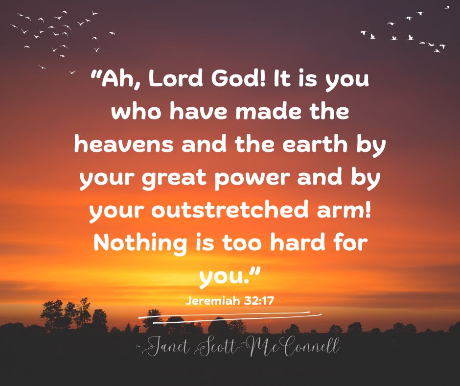 Jeremiah 32:17, “Ah, Lord God!  It is you who have made the heavens and the earth by your great power and by your outstretched arm!  Nothing is too hard for you.”