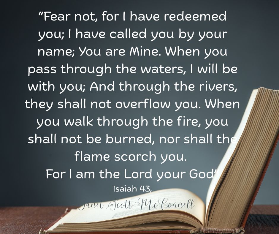 Isaiah 43:1-3a, But now, this is what the Lord says ~ He who created you, Jacob, He who formed you, Israel: “Do not fear, for I have redeemed you; I have summoned you by name; You are mine. When you pass t through the waters, I will be with you; and when you pass through the rivers, they will not sweep over you. When you walk through the fire, you will not be burned; the flames will not set you ablaze. For I am the Lord your God, the Holy One of Israel, your Savior.”
